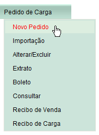 Para criar novo pedido de carga para os cartões de VT, você deve selecionar a opção PEDIDO DE CARGA à NOVO PEDIDO.