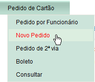 Para novos pedidos de cartão a empresa deve selecionar a opção PEDIDO DE CARTÃO à NOVO PEDIDO.