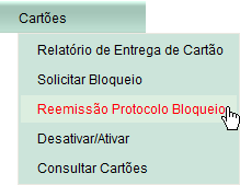 Você pode reemitir o protocolo de bloqueio de cartão selecionando a opção CARTÕES à REEMISSÃO DE PROTOCOLO DE BLOQUEIO.